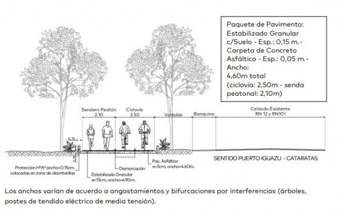 A primeira, com extensão de 6,9 km, irá do museu Imágenes de la Selva (que fica na rua de acesso ao santuário de Santa María del Iguazú) até a intersecção entre as rodovias 12 e 101. A segunda, com 3,2 km, seguirá até o ramal de acesso à Área Cataratas. A terceira e última, de 2,5 km, terá seu ponto final no Centro de Visitantes do parque.