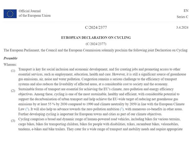 A declaração, publicada no dia 3 de abril na página do diário oficial da UE compromete os países a "aumentarem significativamente" a infraestrutura para bicicletas e apela especificamente à construção de redes de ciclovias dentro das cidades, incluindo ciclovias fisicamente separadas, e ciclovias para ligar os núcleos urbanos aos subúrbios e às áreas rurais mais distantes. A política também estimula a criação de locais para estacionamento seguro de bikes e pontos de recarga para bicicletas elétricas em todas as localidades da Europa..