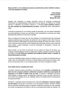 Estamos em um momento de discussão e revisão da legislação sobre calçadas e mobiliário urbano em Curitiba, mas esse processo tem se dado sem diálogo com a sociedade civil, sejam empreendimentos privados ou ativistas e entidades que pautam acessibilidade e mobilidade ativa. O texto foi o produto de dois encontros para discussão sobre o tema e procura resumir e sistematizar as questões debatidas nos encontros, como forma de registro, além de veicular algumas propostas para esse momento da cidade.