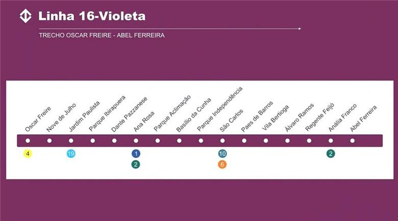 A primeira fase da Linha 16 deverá ter 16 km e 16 estações – entre Oscar Freire, na Zona Oeste, e Abel Ferreira, na Zona Leste. O trajeto deverá ser percorrido em 30 minutos, cerca de 60 minutos a menos do que o tempo de viagem atual, conforme a nota. O novo tramo metroviário terá integração com as linhas 1-Azul; 2-Verde; 4-Amarela, 6-Laranja, 10-Turquesa e a futura Linha 19-Celeste.