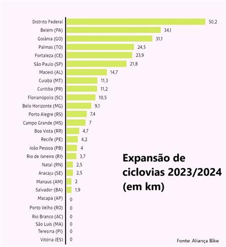 Também no Centro-Oeste está a capital que mais teve crescimento na infraestrutura cicloviária em números absolutos de quilometragem: o Distrito Federal, com acréscimo de 50,23 km nas ciclovias e ciclofaixas implantadas entre 2023 e 2024.