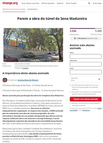 Moradores da região atingida pela obra - nas proximidades do Parque Ibirapuera - organizaram protestos e publicaram um manifesto com um abaixo-assinado contra a continuidade dos trabalhos. O texto aponta os prejuízos ambientais que os túneis trarão para as bacias hidrográficas da área, especialmente pela supressão da vegetação existente.