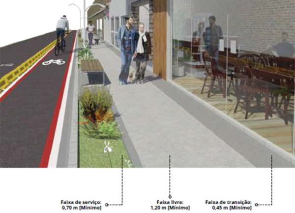 Em relação às calçadas, é muito importante que gestores públicos e cidadãos saibam como elas devem ser feitas. As calçadas devem ser divididas em três faixas: a faixa livre, onde as pessoas circulam, a faixa de serviço, onde devem estar localizadas árvores, postes, bancos, lixeiras, outros tipos de mobiliário urbano ou equipamentos de infraestrutura, e a faixa de acesso, que faz a transição entre a faixa livre e as edificações. As calçadas devem ter uma faixa livre de no mínio 1,20m, sem a presença de qualquer obstáculo que impeça a livre circulação. Além disso, é importante ter uma calçada regular, firme, sem buracos, rachaduras e degraus. Isto é fundamental para prevenir acidentes e tornar o deslocamento seguro e confortável para qualquer cidadão.