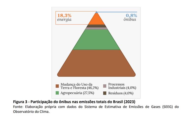 A conclusão mais destacada no texto da NTU indica que os cerca de 107 mil ônibus urbanos que circulam no Brasil jogam na atmosfera somente 0,8% do total de gases de efeito estufa gerados no país. O cálculo, segundo a entidade, foi baseado em informações do Sistema de Estimativa de Emissões de Gases (Seeg 2023), do Observatório do Clima. O dado, em princípio, parece indicar que a atual frota diesel não seria assim tão prejudicial ao ambiente como apregoam os defensores da transição elétrica.