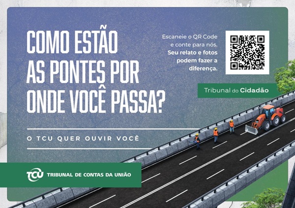 O Tribunal de Contas da União (TCU) iniciou este mês uma consulta pública para todo o território nacional visando levantar informações sobre a qualidade e segurança - para pedestres, ciclistas e motoristas - das pontes existentes nas rodovias federais. O objetivo é saber se o usuário se sente seguro ao trafegar pelas pontes do Brasil.