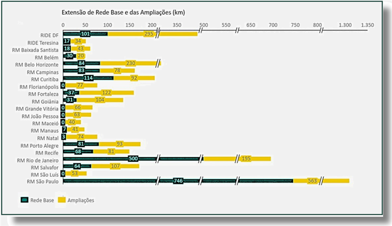 Somadas, as 21 maiores regiões metropolitanas do país têm potencial para expandir em cerca de 2.500 km as redes de transporte urbano até 2054. São elas: Porto Alegre, Florianópolis, Curitiba, Santos, Campinas, São Paulo, Rio de Janeiro, Belo Horizonte, Vitória, Goiânia, Distrito Federal, Salvador, Maceió, Recife, João Pessoa, Natal, Teresina, São Luís, Fortaleza, Belém e Manaus. As 21 regiões têm hoje 2.007 km de redes de transporte público rápido.