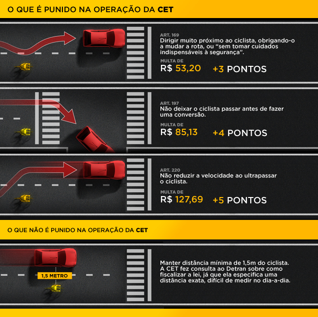 Os motoristas estão sujeitos a três infrações. São multados aqueles que obrigarem o ciclista a mudar seu trajeto, os que não reduzirem a velocidade na ultrapassagem e quem não der preferência à bicicleta nas conversões.