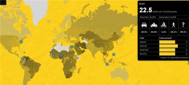 O mapa permite ver claramente que o trânsito mais violento está presente nos países pobres ou em desenvolvimento, como é o Brasil, que ostenta a taxa de 22,5 mortes por 100 mil, o dobro dos Estados Unidos e quatro vezes a taxa da Espanha. "Nestes países, os incidentes estão para se tornar a quinta causa de mortes, superando as provocadas por doenças como a malária e a tuberculose", informa o Pulitzer Center.