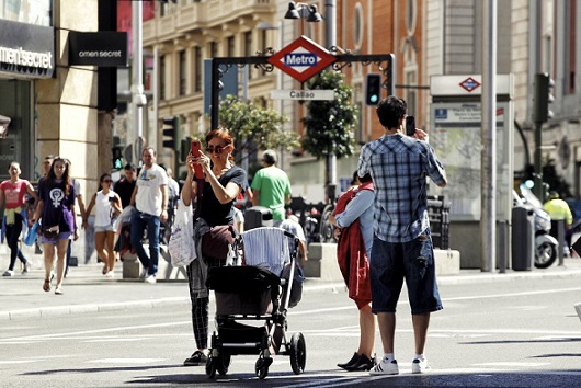 Mulher fotografa a Gran Vía a partir da Plaza de Callao, em Madri. Foto: Claudio Álvarez