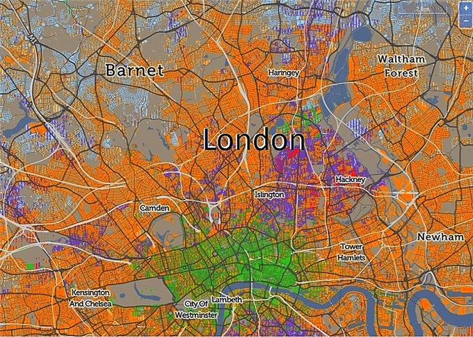 No entanto, também é possível observar grandes áreas em verde e lilás, que representam mobilidade a pé e uso de ônibus, respectivamente, e uma predominância do azul, que simboliza carros ou vans, nas adjacências da metrópole. Como esperado, o uso do ônibus é mais comum nas zonas em que o metrô não alcança principalmente em locais no sul e leste de Londres como Peckham, Stoke Newington, Camberwell e Hackney.